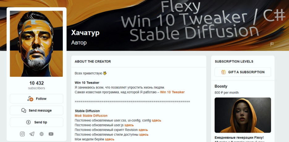 Всех приветствую 🤟 Win 10 Tweaker Я занимаюсь всем, что позволяет упростить жизнь людям. Самая известная программа, над которой Я работаю – Win 10 Tweaker ЛУЧШИЙ СЕРВИС ГЕНЕРАЦИИ КОНТЕНТА ➜ FLEXY ============================================================ Stable Diffusion Мой...boosty.to