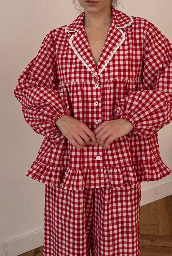 Рубашка “Эмилия” большого объёма А-силуэт достигается расширенной на сборке нижней части рубашки и рюш.. Отрезные кокетки по переду и спинке, нижние части рубашки расширенные и собранные на сборку. По низу изделия рюша на сборке. Длина изделия ниже уровня бёдер. Английский воротник и лацкан со скругленными уголками. Рубашка однобортная. Застёжка на прорезные петли и пуговицы. Линия плеча спущенная. Рубашечный рукав расширенный к низу , по низу кулиска на резинке.