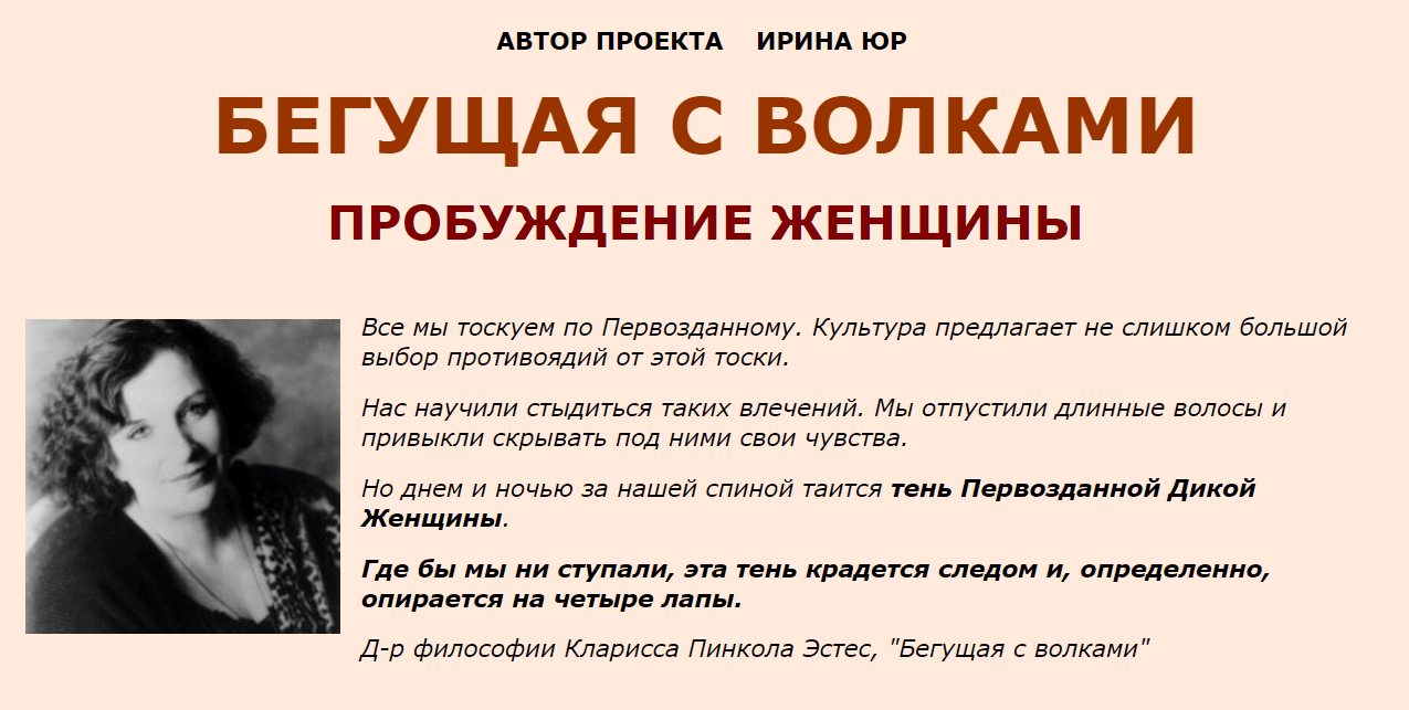 А в этом блоке я приглашаю Вас соединиться со своей Дикой Женской Душой, откликнуться на ее зов, познакомиться с Хранительницей Первозданной Женственности и победить Внутреннего Хищника.