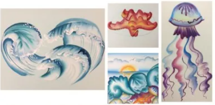 Результат: нарисуете серию сюжетов с ракушками, камешками, морской звездой, медузой и объедините все элементы в одну композицию с морским пейзажем.